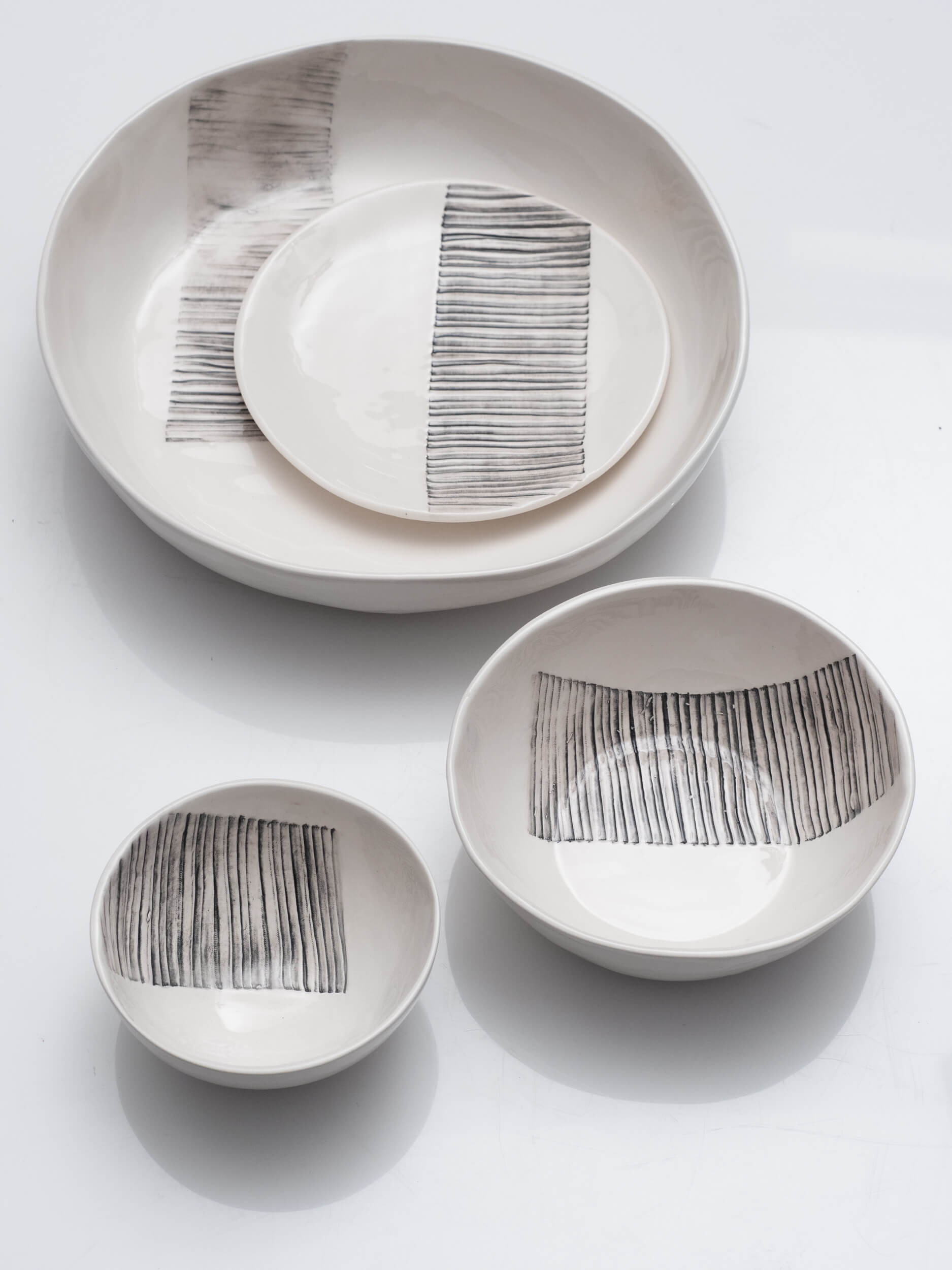 Στο εργαστήριό της στην Αθήνα, συνδυάζει την παράδοση της ελληνικής κεραμικής με μια καθαρή, σύγχρονη αισθητική.